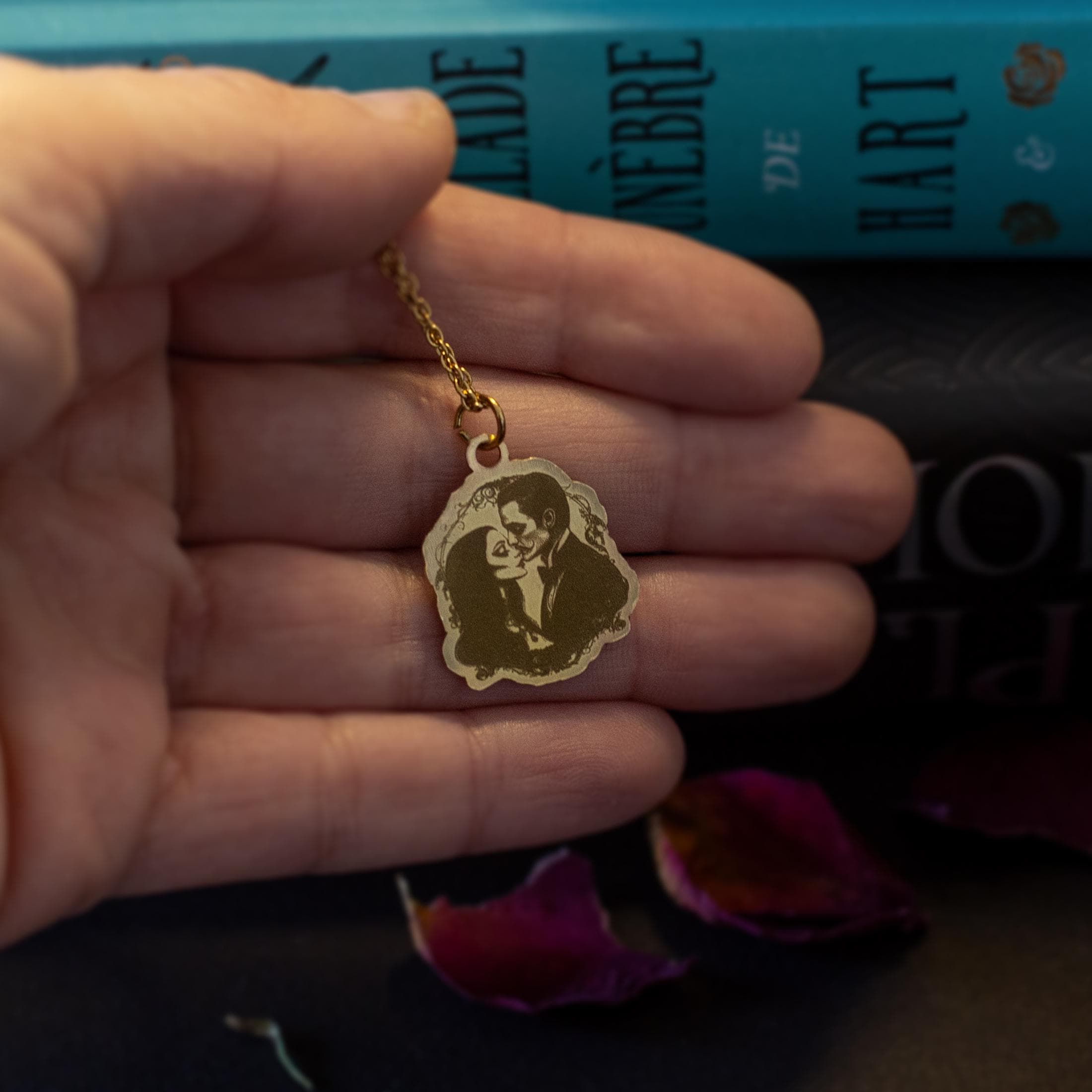 Entrez dans l'amour intense et le romantisme avec ce pendentif en hommage à ce couple magique et icône du gothique au cinéma.