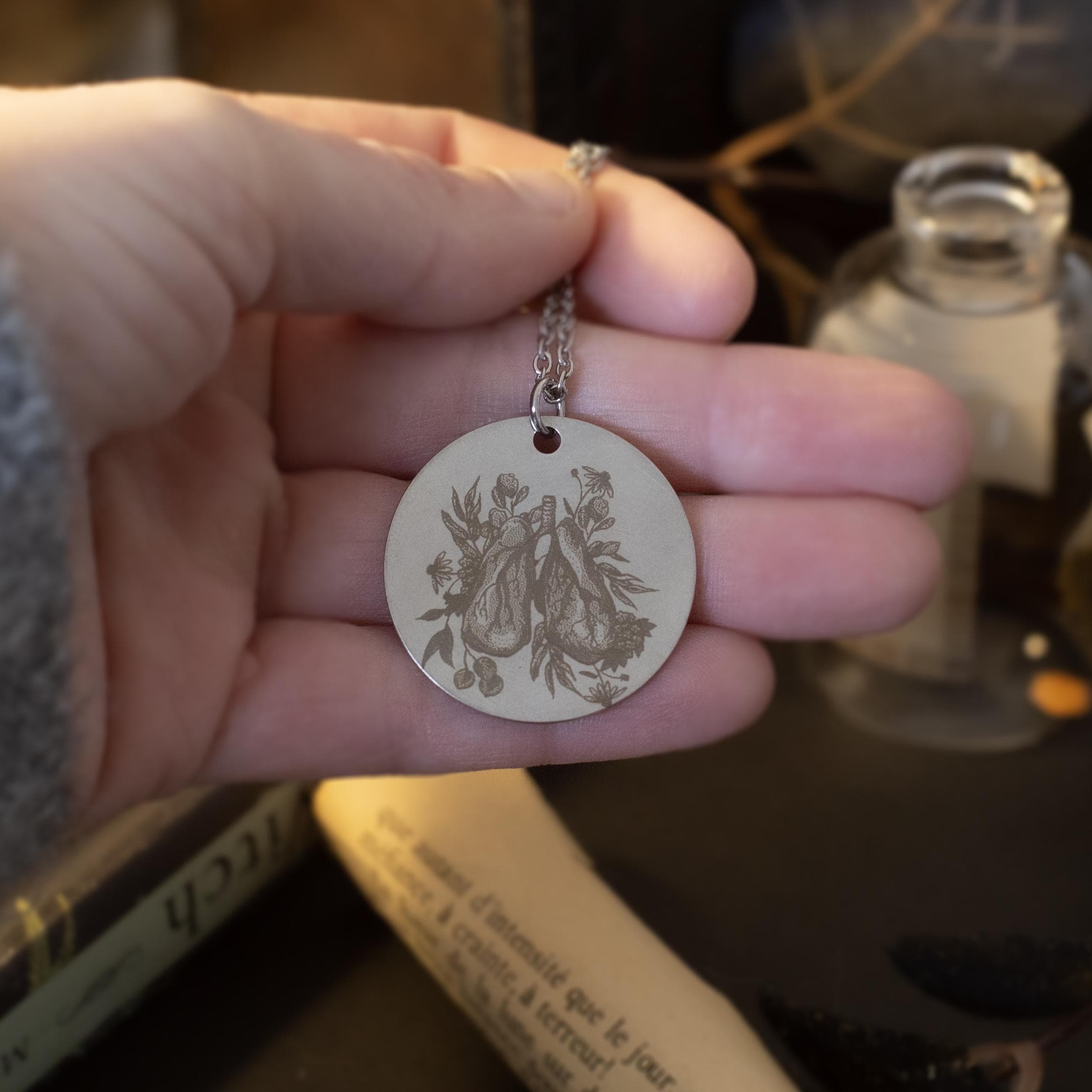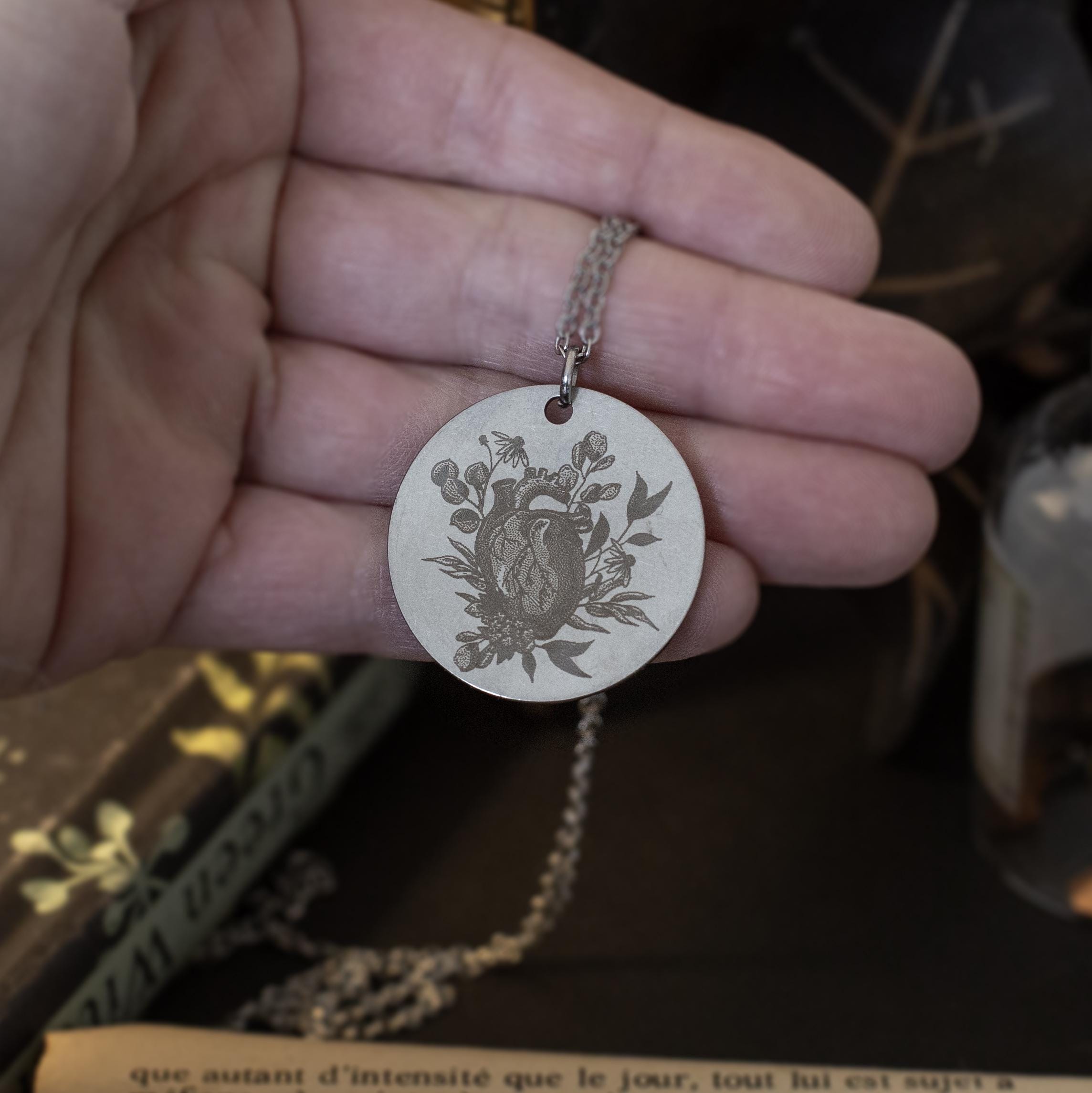 Plongez dans un univers où l’art de la gravure rencontre la beauté brute de la nature… Ces médaillons en acier inoxydable sont finement gravés avec des illustrations de parties anatomiques, sublimées par des fleurs délicates. Chaque pièce incarne l’harmonie entre la fragilité du corps humain et la puissance de la nature florale.