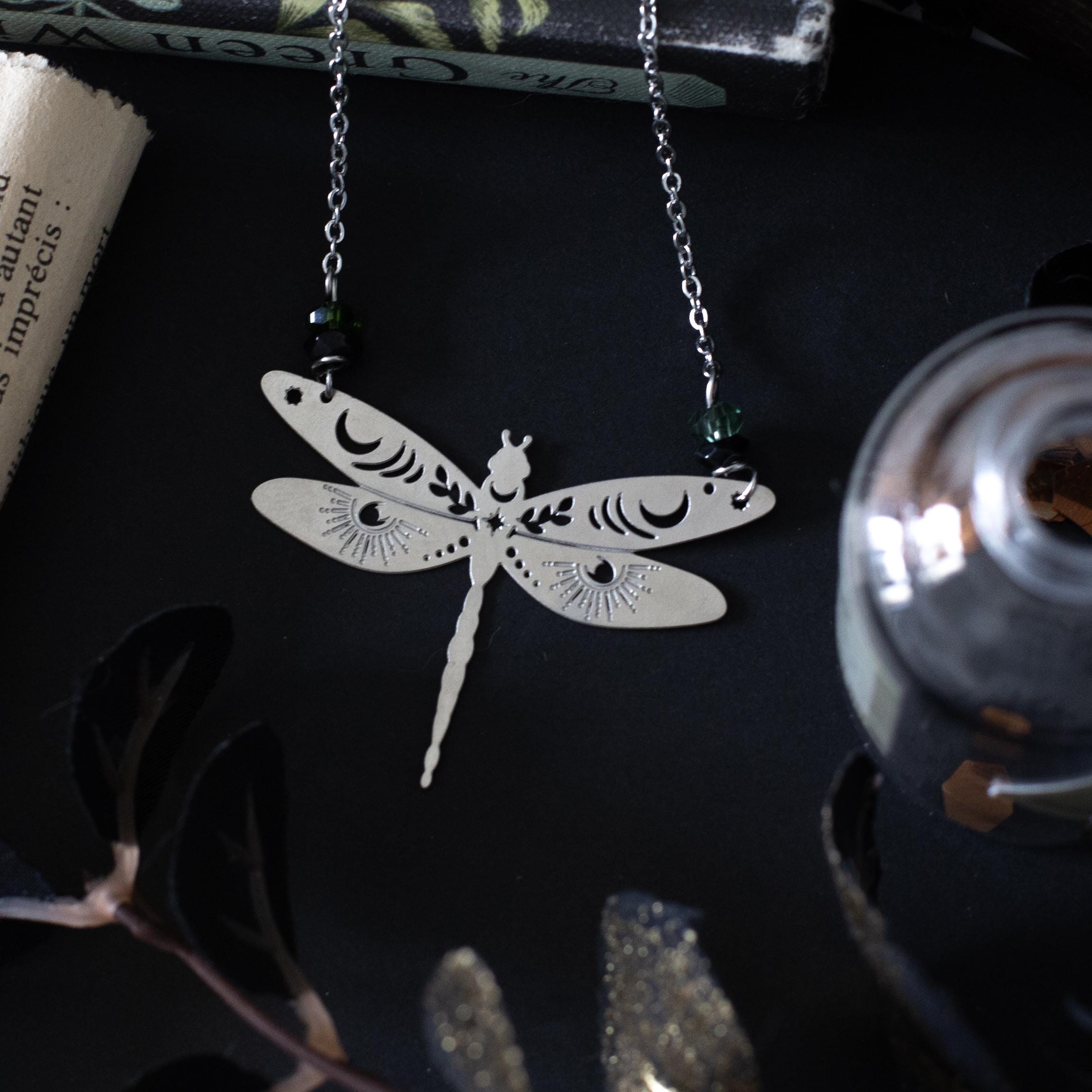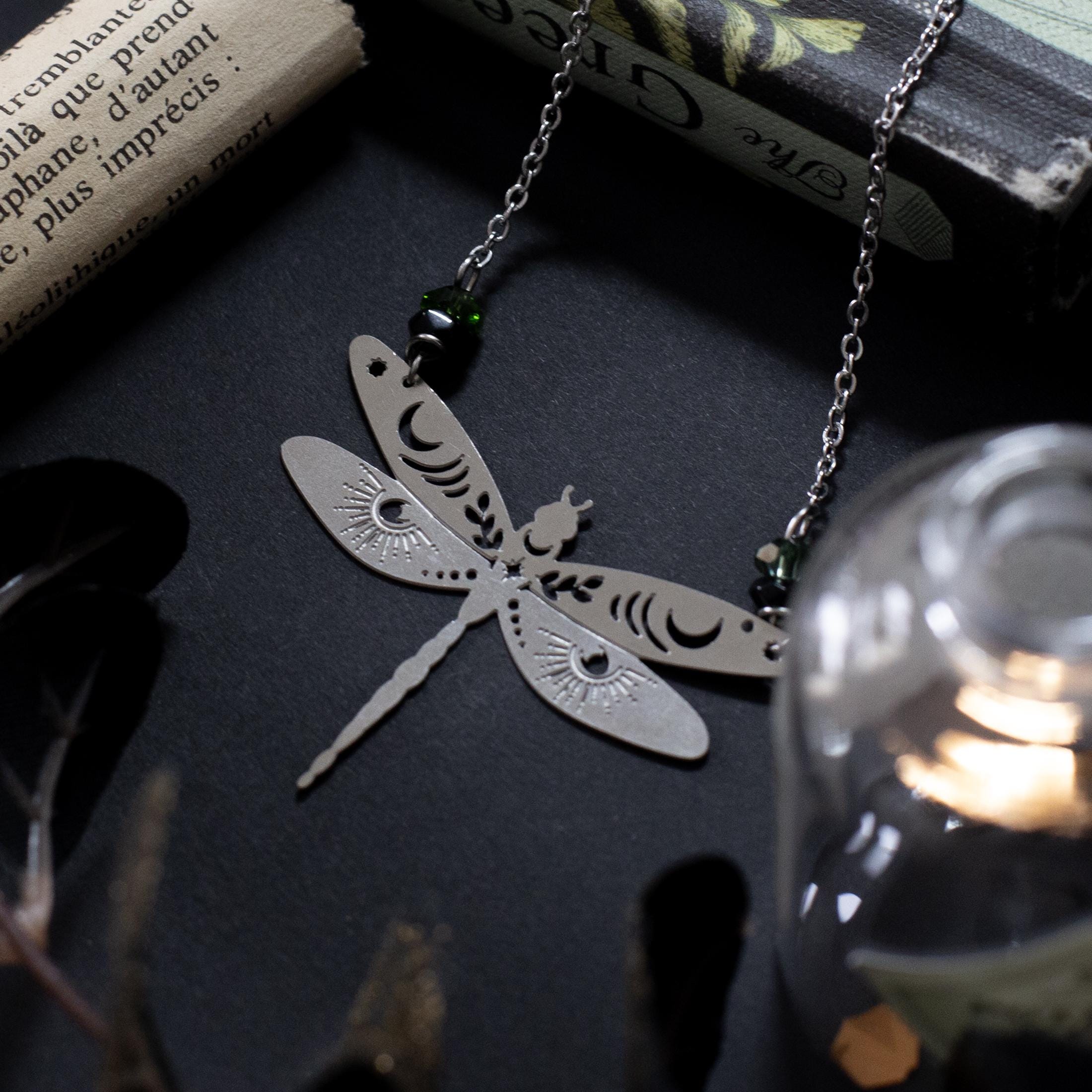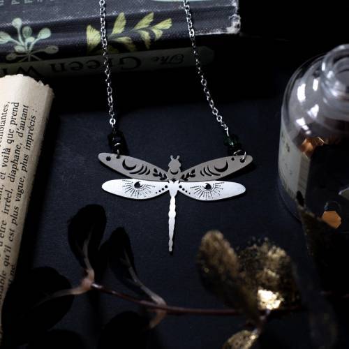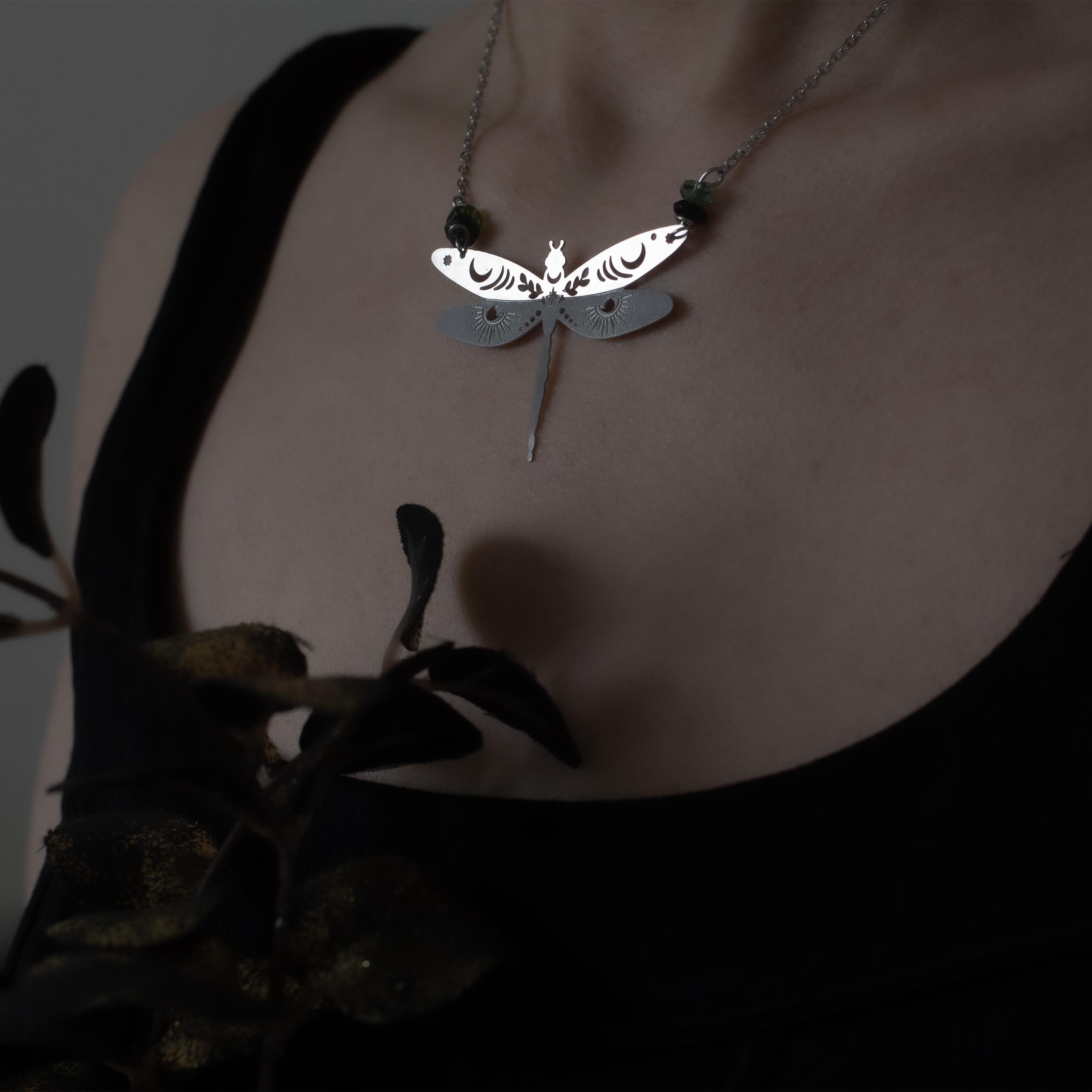 la légèreté de l’acier inoxydable à l’éclat envoûtant des perles vertes. La libellule, symbole de transformation et de liberté, se pose gracieusement sur la peau, accompagnée de perles aux nuances verdoyantes, comme une brume printanière légèrement teintée de mystère.