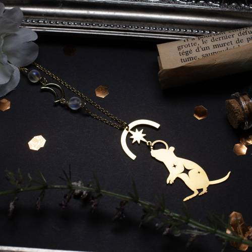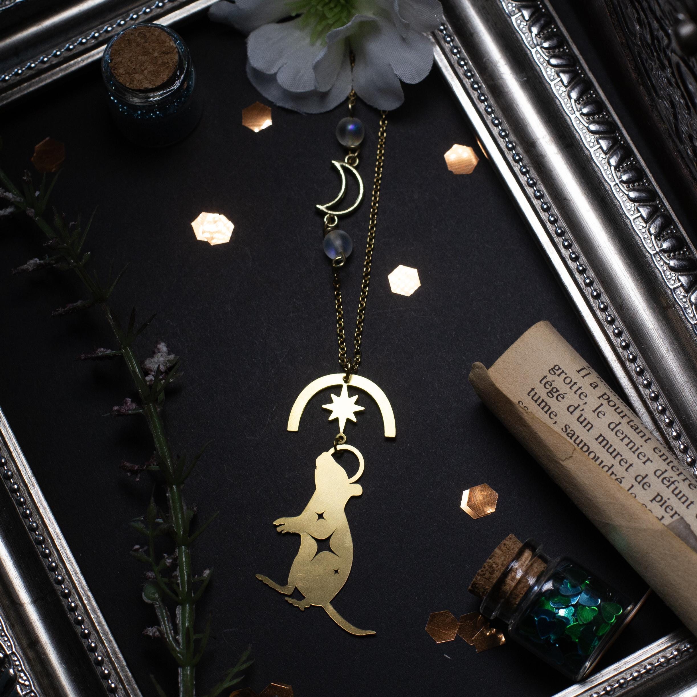 Le collier "Mélodie des Ombres" est une ode à l’énigmatique légende du Joueur de Flûte de Hamelin. Son pendentif représente un rat mystique, guidé par la lumière d’une lune argentée et d’une étoile scintillante, comme les âmes égarées fascinées par une musique envoûtante.