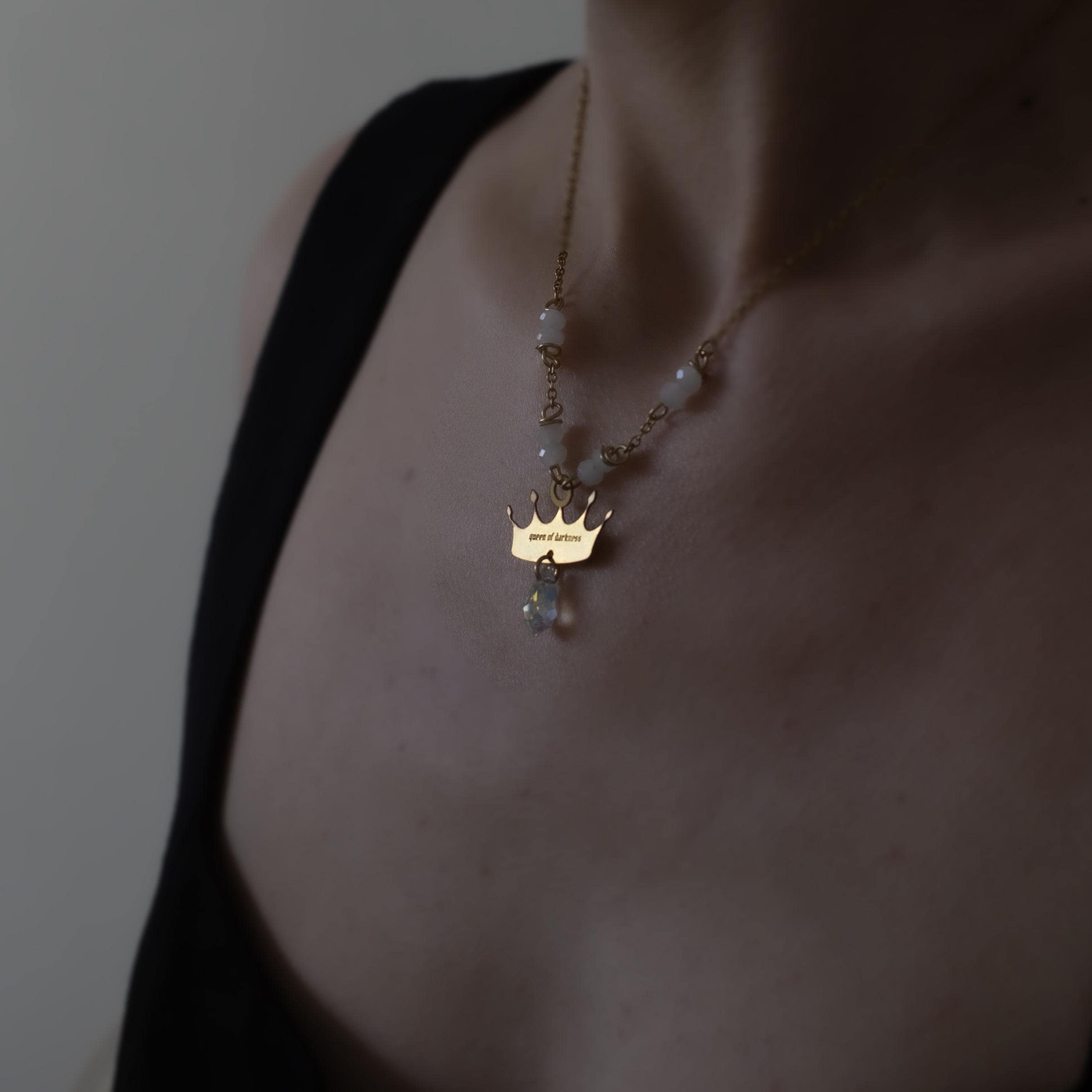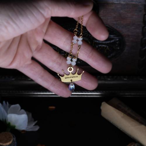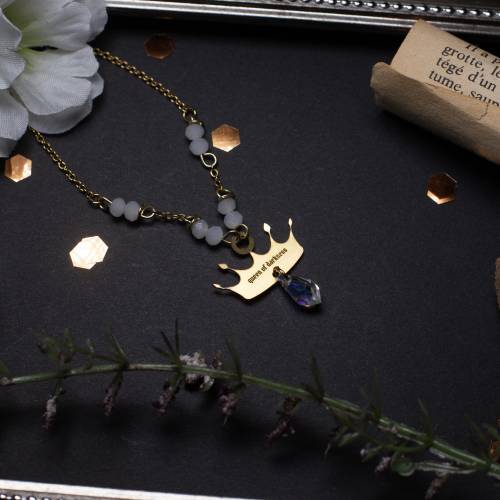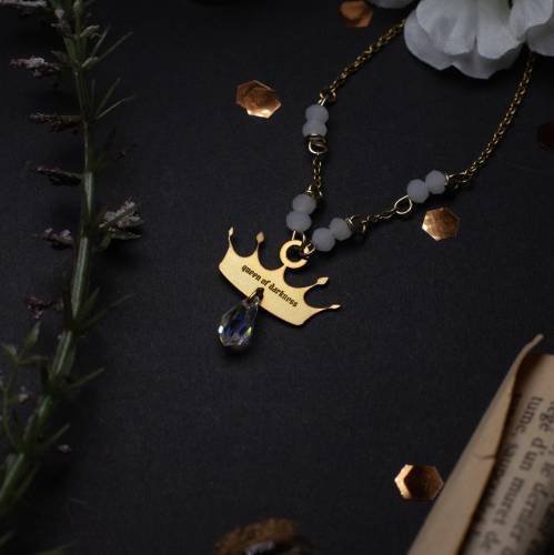 Le collier "souveraine nocture" incarne l’élégance d’une souveraine nocturne. Composé de perles blanches nacrées et d’un pendentif en forme de couronne, gravé des mots "Queen of Darkness", ce bijou est un hommage aux âmes fortes et mystérieuses, aux reines des ombres qui règnent avec grâce et audace.