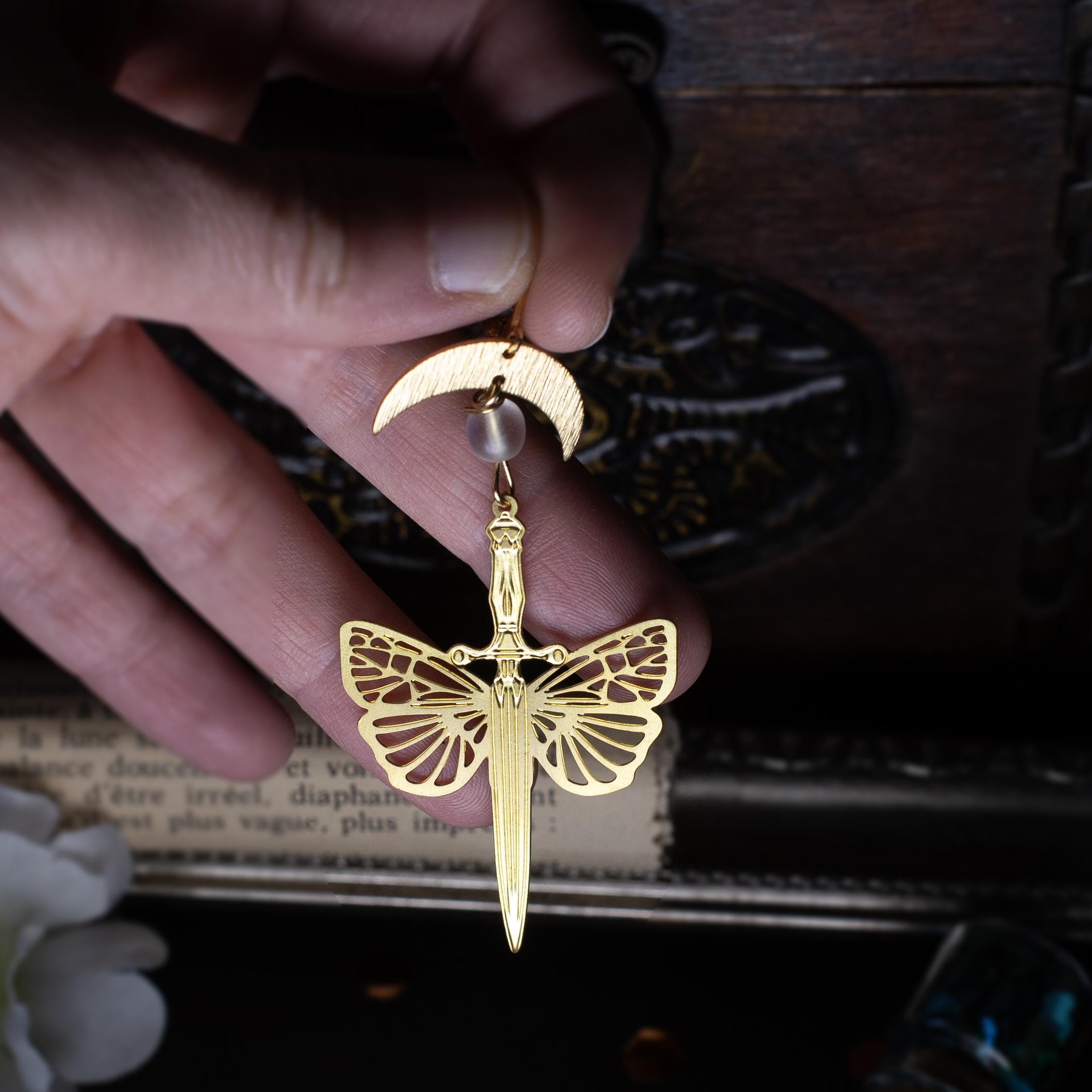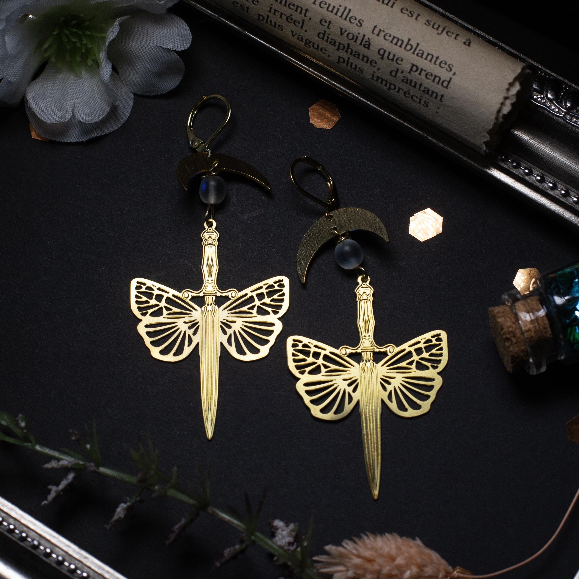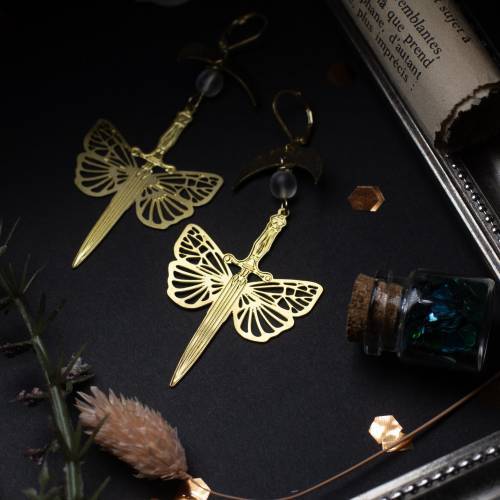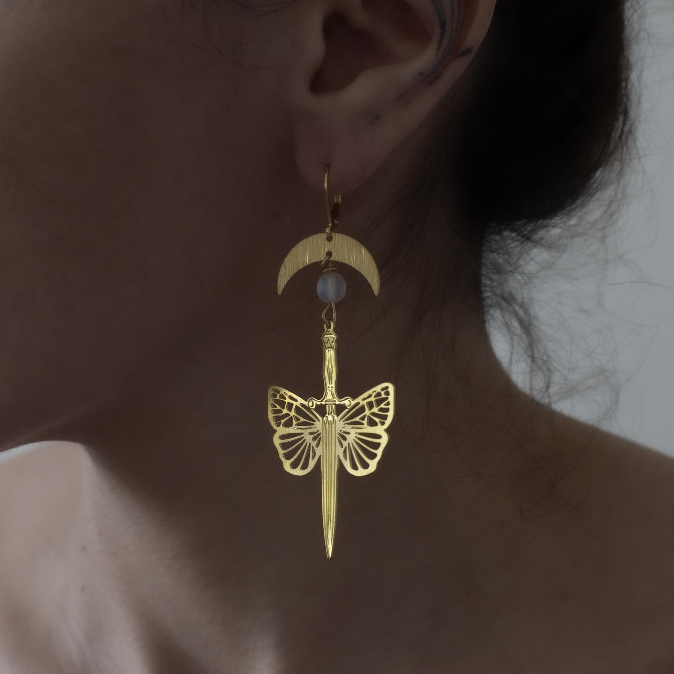 Plongez dans l’univers des contes enchantés avec "La Malédiction Endormie", une paire de boucles d’oreilles inspirée du mythe intemporel de La Belle au Bois Dormant. Ces boucles, représentant une épée et des ailes, symbolisent le combat entre la lumière et les ténèbres, l’enchantement et le réveil.